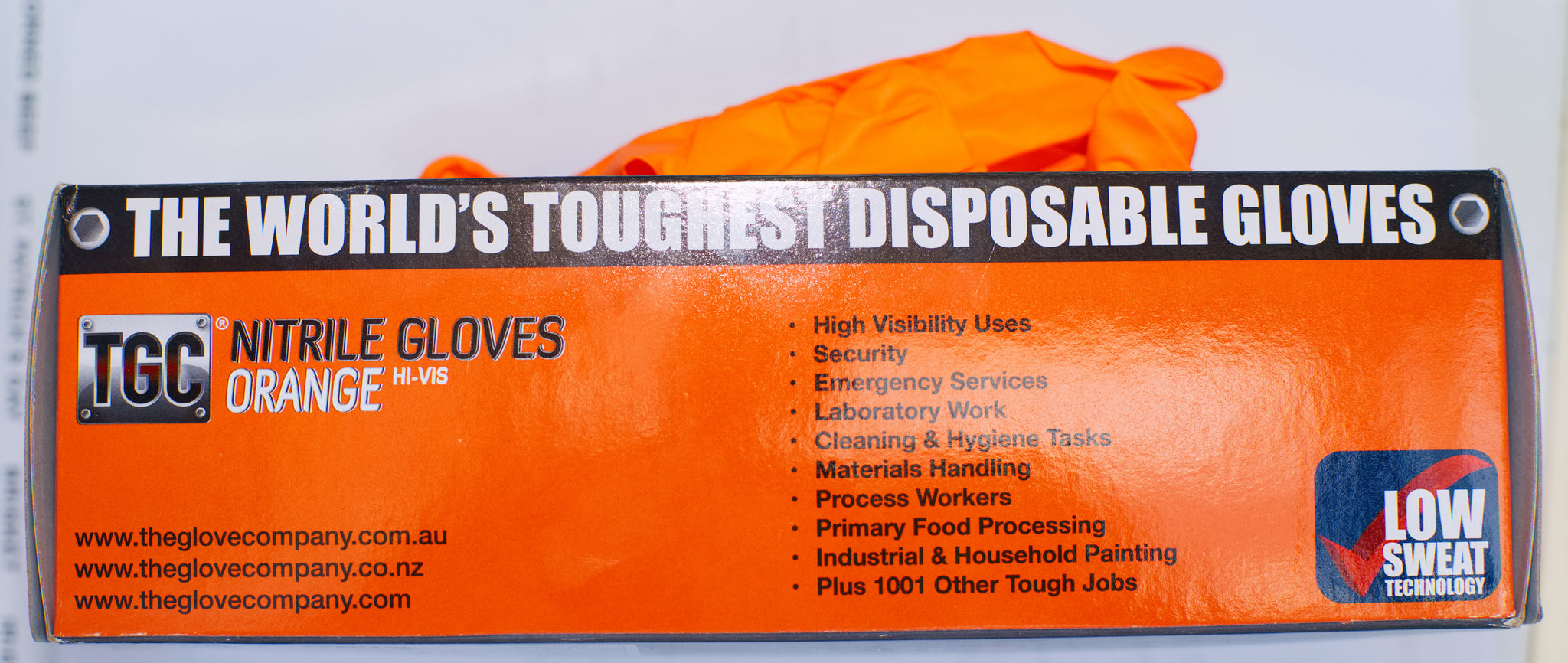 These Hi-Vis Safety Orange disposable nitrile gloves from The Glove Company have continued to lead the way, setting new industrial standards in disposable gloves. As the number one preferred glove for aviation maintenance and chemical handling these gloves feature a high-impact orange visual contrast surface making it easy to detect hazardous contaminants and prevent cross contamination. Resistent to over 140 commonly used chemicals TGC Work Gear's Orange Nitrile gloves also feature an incredible resistance to breakage and puncture and offer unsurpassed comfort for extended wearing times.